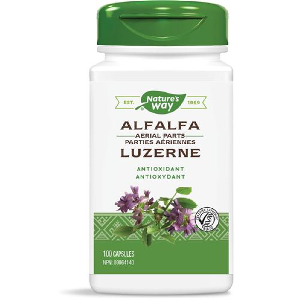 Nature's Way Luzerne 100 Capsules: Biedt antioxidanten. Nature's Way® betrekt de tere jonge alfalfaplanten om een groot deel van de soepele bladeren te leveren en om de opname van houtachtige stengels te voorkomen. Alfalfa is een bron van chlorofyl, beta-caroteen en andere heilzame stoffen. Nature's Way Alfalfa biedt antioxidanten. Het actieve ingrediënt is biologisch en is afkomstig van de bovengrondse delen (bladeren) van de plant die het hoogste antioxiderende voordeel bieden. Nature's Way Alfalfa is vegetarisch, TRU-ID gecertificeerd en niet-GMO-project geverifieerd. Ingrediënten: Elke capsule bevat: Biologische alfalfa, bovengrondse delen (Medicago sativa) 405mg Niet-medicinale ingrediënten: Pullulan, kaliumchloride, carrageen. Aanbevolen dosis: Volwassenen nemen 3 capsules 3 keer per dag. Waarschuwingen: Raadpleeg voor gebruik een arts als u bloedverdunners gebruikt. Raadpleeg voor gebruik een arts als u een standaardbehandeling of anticonceptie gebruikt. Niet gebruiken als u zwanger bent of borstvoeding geeft. Niet gebruiken als u een voorgeschiedenis heeft van systemische lupus erythematosus.