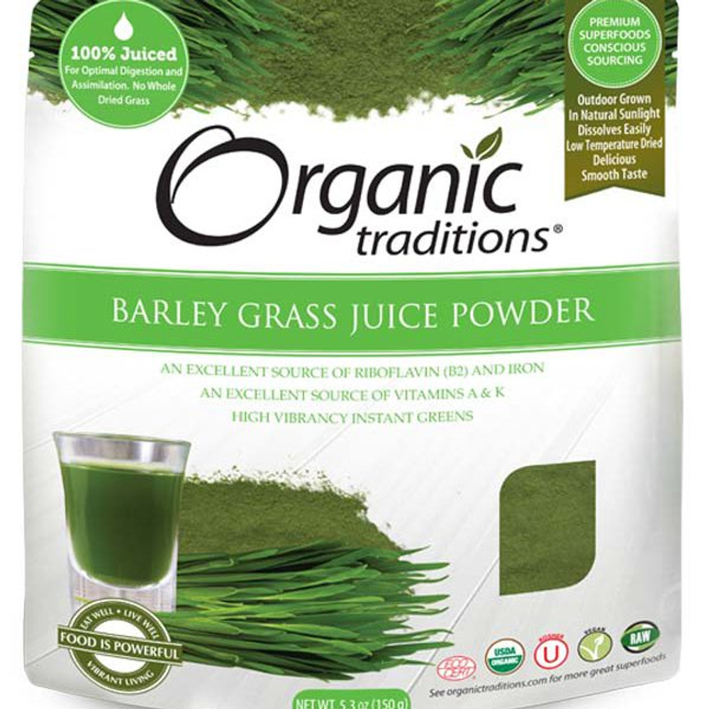 Organic Traditions Barley Grass Juice Powder wordt gemaakt van het jonge, voedzame gras van gerst in zijn plantaardige staat. Dit krachtige jonge groene gras bevat een overvloed aan chlorofyl, vitamines, mineralen en antioxidanten. Ons gecertificeerd biologisch gerstgras wordt duurzaam buiten gekweekt in mineraalrijke oude bodembedden in zonlicht, in tegenstelling tot plastic bakken binnenshuis onder kunstlicht.