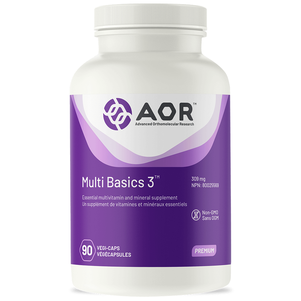 AOR Multi Basics 3 - 180 Veg-capsules: Een complete multivitamine. Multi Basics 3 bevat alle erkende essentiële vitamines als onderdeel van een multivitaminen/mineralencomplex voor het behoud van een goede gezondheid. Multi Basics 3 helpt ook bij een normale groei en ontwikkeling. Bevat alle erkende essentiële voedingsstoffen Biedt voedingsstoffen in goed uitgebalanceerde verhoudingen Weerspiegelt biologische behoeften en vermijdt schadelijke excessen Bevat voedingsstoffen in hoeveelheden die in een optimaal dieet voorkomen Hoewel veel multivitaminen voedingsstoffen leveren in vormen van lage kwaliteit, onvoldoende hoeveelheden of onevenwichtige verhoudingen, probeert Multi Basics 3 al deze factoren te corrigeren, waardoor een solide basis wordt gelegd voor een goede gezondheid. Multi Basics 3 biedt optimale doseringen en uitgebalanceerde verhoudingen van alle erkende essentiële vitamines en mineralen in hoogwaardige, door onderzoek ondersteunde vormen, alles in slechts 3 capsules per dag. Een uitgebalanceerde en goed ontworpen multivitamine is van fundamenteel belang voor elk supplementregime. Multivitamine- en mineraalformuleringen zijn een uitstekende manier om aan uw dagelijkse voedingsbehoeften van alle essentiële voedingsstoffen te voldoen, en bieden een basis waarop u uw weg naar een goede gezondheid kunt bouwen. Terwijl sommige voedingsstoffen zoals vitamine A en E beter worden opgenomen en effectiever zijn in hun natuurlijke vorm, worden andere beter opgenomen in synthetische supplementvorm, zoals foliumzuur en andere B-vitamines. Sommige voedingsstoffen, zoals zink en koper, moeten in evenwichtige verhoudingen worden toegediend om bepaalde lichaamsfuncties niet te verstoren. Te veel van sommige voedingsstoffen, zoals vitamine B2, kan de opname van andere voedingsstoffen zelfs remmen, terwijl te weinig gewoon niet effectief is. Multi Basics 3 houdt rekening met al deze factoren en creëert zo een zorgvuldig samengestelde, uitgebalanceerde en effectieve multivitamine die veel meer voordelen biedt dan een typische dagelijkse multivitamine. Ingrediënten: 3 capsules bevatten: Vitamine A-complex Retinol (palmitaat) Bèta-caroteen Luteïne-esters 110mcgRAE/363IU900mcgRAE/1,8 mg6 mg Vitamine B-complex B1 (thiamine)B2 (riboflavine)B3 (niacine - van 126 mg inositolhexanicotinaat†)B5 (calcium-D-pantothenaat)B6 (pyridoxine)B12 (cyanocobalamine)Foliumzuur (calcium L-5-MTHF)BiotineCholine (bitartraat )Inositol (van Inositol, Inositol Hexanicotinaat†) 9 mg2,5 mg115 mg100 mg25 mg647 mcg800 mcg300 mcg100 mg100 mg Vitamine C-complex Vitamine C (magnesiumascorbaat) Gemengde Citrusbioflavonoïden Quercetine 120 mg25 mg65 mg Vitamine D3 (cholecalciferol) 25 mcg/1000 IE Vitamine E-complexVitamine E-complex:Gemengde tocoferolen (soja, min. 65% gamma)Vitamine E (uit alfa-tocoferol)Gemengde tocotriënolen (palm) 100 mg*7,1 mg AT/10,6 IE10 mg‡ Vitamine K2MK-4MK-7 (uit soja) 120 mcg60 mcg60 mcg Boor (citraat) 700 mcg Calcium (citraatmalaat) 65mg Chroom (picolinaat) 100 mcg Koper (citraat) 1,5mg Jodium (kaliumjodide) 150 mcg Magnesium (citraat, ascorbaat) 60mg Mangaan (bisglycinaat) 2,3mg Molybdeen (Na-molybdaat) 45 mcg Selenium (Selenomethionine) 55 mcg Silicium (HVP-chelaat uit soja) 5mg Vanadium (citraat) 18 mcg Zink (citraat) 11mg †Totale hoeveelheid inositolhexanicotinaat: 126mg *Tocoferolen: >7,1 mg alfa, >1,3 mg bèta, >64,8 mg gamma, >13,9 mg delta. ‡Tocotriënolen: >2,8 mg alfa, >0,4 mg bèta, >5,1 mg gamma, >1,4 mg delta. Niet-medicinale ingrediënten: microkristallijne cellulose, dicalcium- en tricalciumfosfaat, siliciumdioxide, dextrine, tocoferolen, natriumstearylfumaraat, cellulosegom, ascorbylpalmitaat, natriumalginaat, sorbitanstearaat, sucrose, Arabische gom, palmolie, hydroxypropylcellulose, maltodextrine, zetmeel (soja, maïs, erwten, rijst), gemodificeerd maïszetmeel, zeaxanthine. Capsule: hypromellose. Zuiverheid: alle ingrediënten zijn vermeld op het etiket. Bevat geen tarwe, gluten, pinda's, sesamzaad, sulfieten, mosterd, zuivel of eieren. Aanbevolen dosis: (Volwassene): Neem dagelijks maximaal 3 capsules bij een maaltijd die vet bevat, of zoals voorgeschreven door een gekwalificeerde zorgverlener. Neem een paar uur voor of na het innemen van andere medicijnen. Waarschuwingen: Raadpleeg voor gebruik een arts als u bloedverdunners of voorgeschreven medicijnen gebruikt, aangezien de fytonutriënten in dit supplement hun metabolisme of biologische beschikbaarheid kunnen beïnvloeden. Raadpleeg een zorgverlener voor gebruik langer dan 12 weken. Niet gebruiken als u zwanger bent of borstvoeding geeft of als u allergisch bent voor planten van de familie Asteraceae/Compositae/Daisy. Dit product bevat soja. Niet gebruiken als u een soja-allergie heeft. Belangrijkste toepassingen: ondersteuning voor vitamines/mineralen.